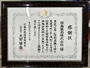 10月12日に尾道警察署から感謝状を頂きました。
